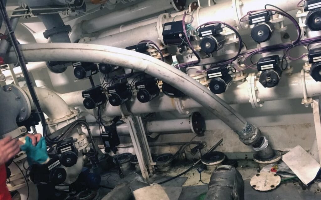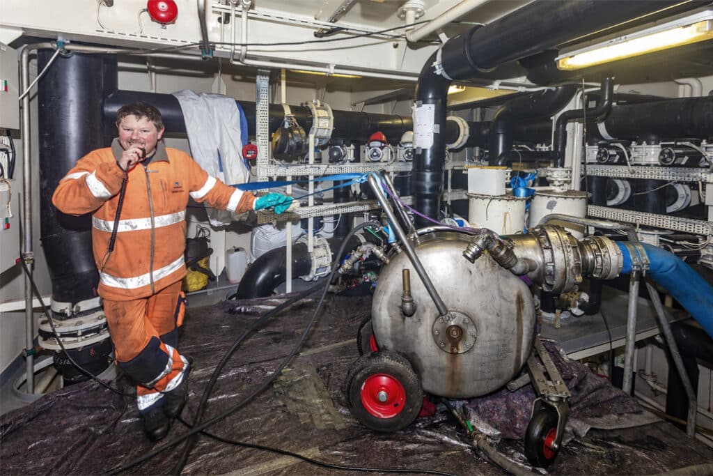 Renovation was carried out on 17 selected 6-inch pressure pipes, where cavitation corrosion had been detected, particularly on bends. 400 m3 of seawater per hour are pumped through the pipes – from the pump house mid-ship at the bottom of the ship, with piping through the fuel tank, to the ship’s fish and ballast tanks.